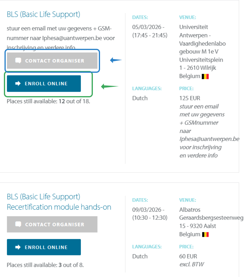 Click on : Contact Organiser: online enrollment has not been selected as an option, to enroll in the course or ask additional information about the course us this button.