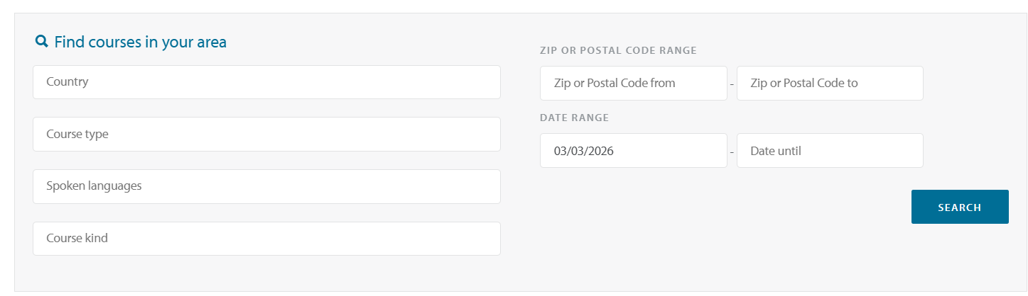 Select 1 or multiple countries, search for a specific course type, search on course language, select a date range